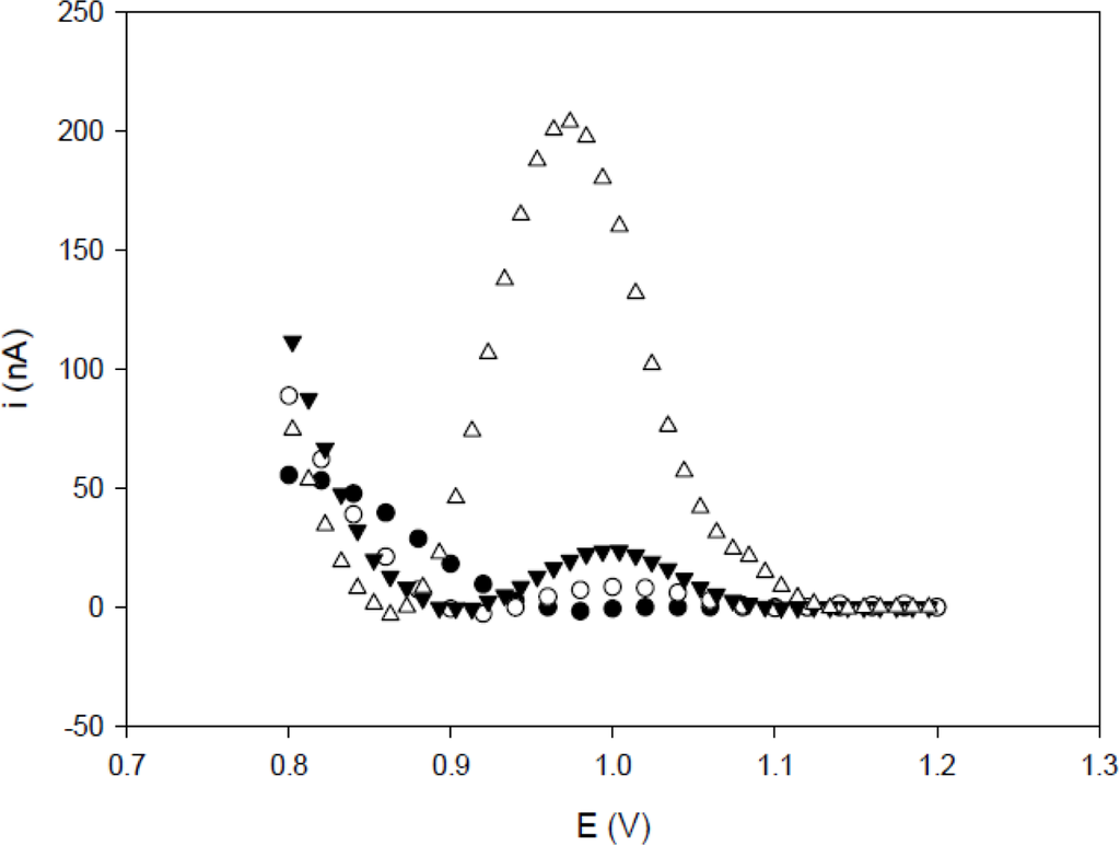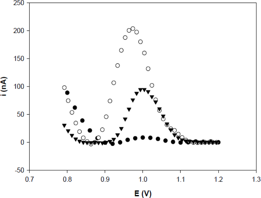 The results are shown in the voltammogram for guanine oxidation (0.97 V in 20 mM Tris-HCl buffer solution, pH 7) on the probe-modified and activated PGE, before and after hybridization in solutions of complementary and non-complementary oligonucleotides (Figure 5). The current peak generated by guanine oxidation was monitored by the detection of the target oligonucleotides. The probe contains seven guanine bases, and after hybridization with the target sequence it contains only five guanines, thus there is a significant reduction in the guanine oxidation peak.