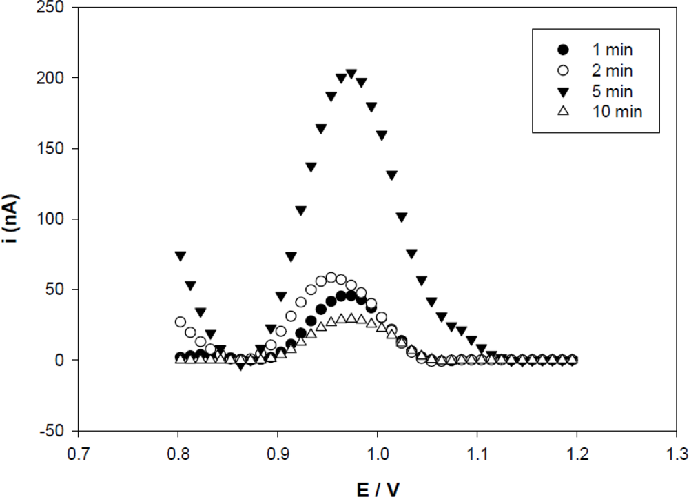 Probe immobilization is a crucial step for fabricating an electrochemical biosensor [18]. In Figure 3, the results obtained with anodic differential pulse (ADP) show the guanine oxidation signal increasing with time up to 5 min and decreasing significantly after that. This decrease can be attributed to the massive accumulation of the probe [29] on the graphite electrode, leading to an overlapping of the probes and lower availability of guanine bases. These results showed that probe immobilization could be achieved within 1 to 10 min. However, five minutes was suggested as the optimal time for probe immobilization since the electrode achieved a higher peak current. This result also was found in the systems for gene detection of interleukin-2 [29], hepatitis B [15] and electrochemical detection for human papilloma virus [23].