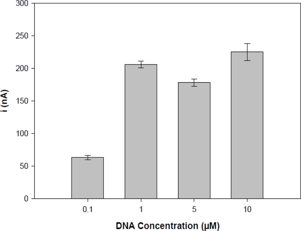 The effect of probe concentration is shown in Figure 4, it was carried out by differential pulse voltammogram after 5 min of oligonucleotides (TS-1P) immobilization using a potential of 0.5 V in acetate buffer (pH 4.8) containing different concentrations of probe (0.1 to 10 μM).