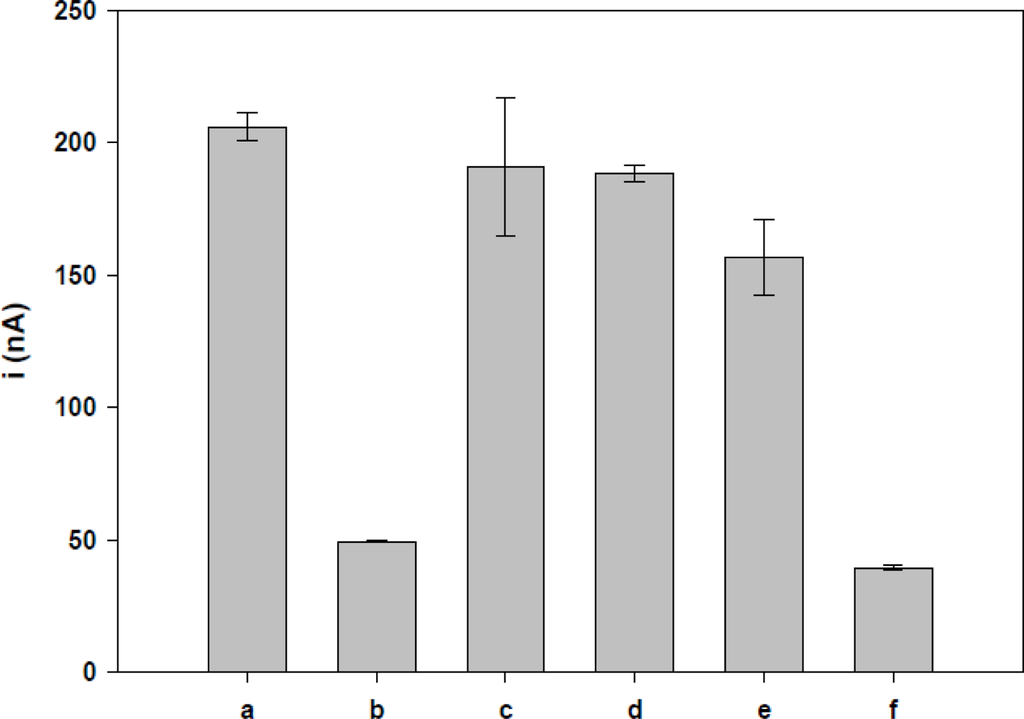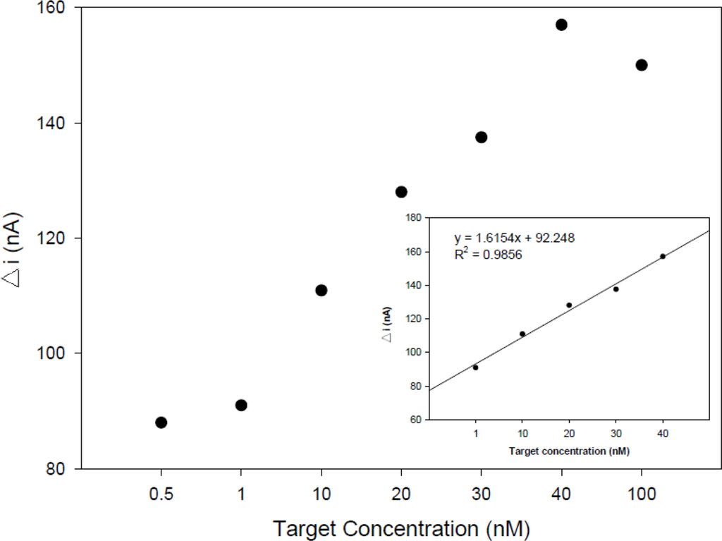The detection limit and quantitation limit values were calculated using the following equations: yLOD = 3s/m and yLOQ = 10 s/m, respectively [34], where s is signal of the standard deviation of the blank (0.5 nM), and m is the slope (1.6154) of the related calibration line. The regression equation was ΔI = 1.6154C + 92.248 (C, nM; ΔI, A), thus the detection limit (0.92 nM) and quantitation limit (3.09 nM) were measured, and both values confirmed the sensitivity of the device. The within day and between day reproducibility (R.S.D.%) results of the signal (three independently probes) measured at 40 nM of target were 0.61% and 1.72%, respectively, indicating a remarkable reproducibility of the detection method.