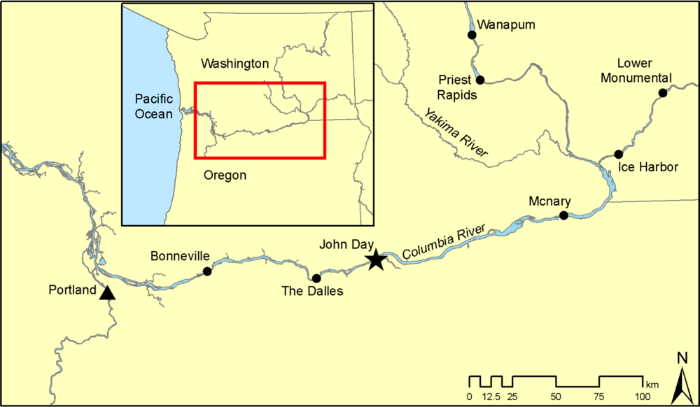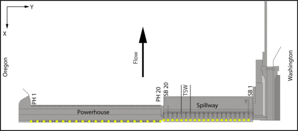 The John Day Dam, owned and operated by the U.S. Army Corps of Engineers, is located on the Columbia River at river kilometer (rkm) 348, approximately 45 km east of the city of The Dalles, Oregon (Figure 1). The dam consists of a powerhouse, spillway, and navigation lock, with fish ladders at either end of the dam. The powerhouse is 602 m long and consists of 16 turbines with nameplate capacity of 135 MW each and overload capacity of 155.3 MW each. The spillway has an overall length of 374 m and contains 20 gates, each 15.2 m wide. Two prototype top-spill weirs (TSWs) were installed at spillbays 15 and 16 during 2008.