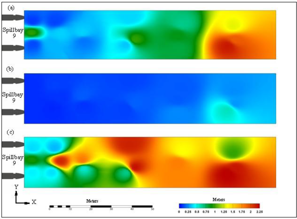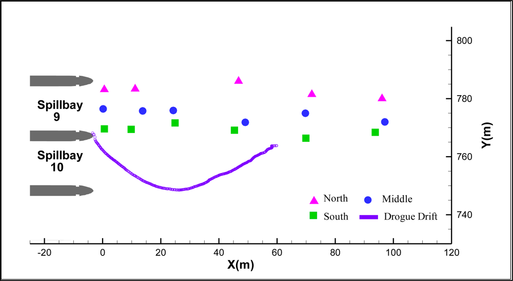 All of the systems had similar functional and geometric designs, so only one spillbay (SB) was selected for model validation and error analysis. The locations of the acoustic transmitters for all test cases were obtained through a real-time kinematic GPS system (Trimble RTK 5700 with Zephyr Geodetic antenna, Trimble Navigation Ltd., Sunnyvale, CA, USA), which provided benchmark measurements for comparison with the 3D-tracked locations. The accuracy was assessed in terms of median and root mean square (RMS) values of the differences between GPS measurements and the source locations computed from 3D tracking codes: