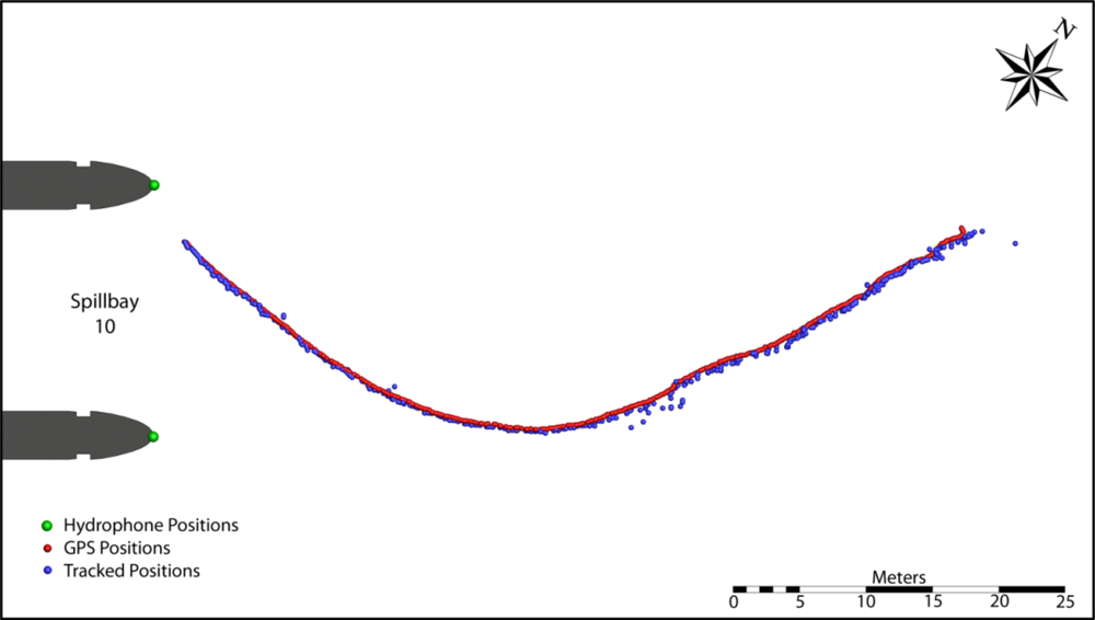 To assess the accuracy of the deployed hydrophone arrays and validate tracking solvers, several tests were conducted using acoustic transmitters with GPS receivers fixed at various locations or drifting upstream of the John Day Dam powerhouse (PH) and spillway. Two hydrophones were installed at each main pier nose at two elevations throughout the dam (Figure 2).