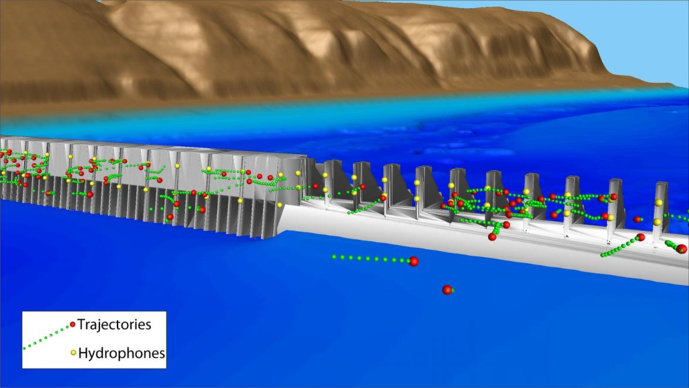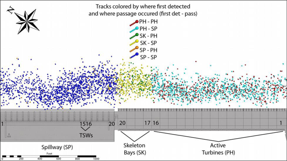 Despite advances in turbine design and dam operations, passage through turbines and spillways may injure or kill downstream-migrating juvenile salmon [1–6]. The design and operation of more fish-friendly hydroelectric facilities require reliable estimates of behavior, timing, and survival of the juvenile salmonids as they migrate downstream [7–10]. Three-dimensional (3D) position estimates of fish surgically implanted with acoustic transmitters can provide near-dam fish behavior and passage route-specific survival rates. In addition, 3D position estimates provide near-dam vertical distribution data required for other important turbine passage evaluation techniques such as blade-strike modeling [5,10].