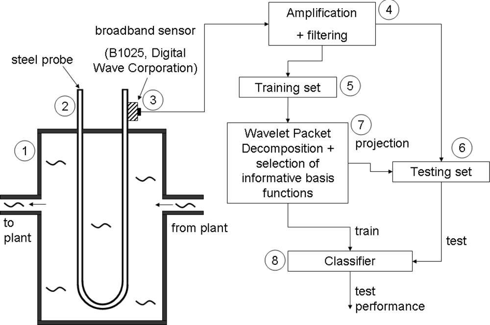 Figure 1. Processing stages for making predictions of the corrosion type. A steel probe (2) is inserted in a bypass (1) of the chemical process plant and is therefore exposed to the same environmental conditions as the installation. Acoustic events are captured by means of a broadband sensor (3). Subsequently AE signals are amplified and filtered (4). In order to obtain a fair validation of the system, the acquired signals are split into a training (5) and testing set (6). Features are extracted from the training signals by means of a Wavelet Packet Decomposition (7). A classifier (8) is trained based on the selected wavelet coefficients of the training set. Testing signals are projected onto the selected basis functions. Subsequently, the wavelet coefficients of the testing signals are used to test the overall performance of the system.
