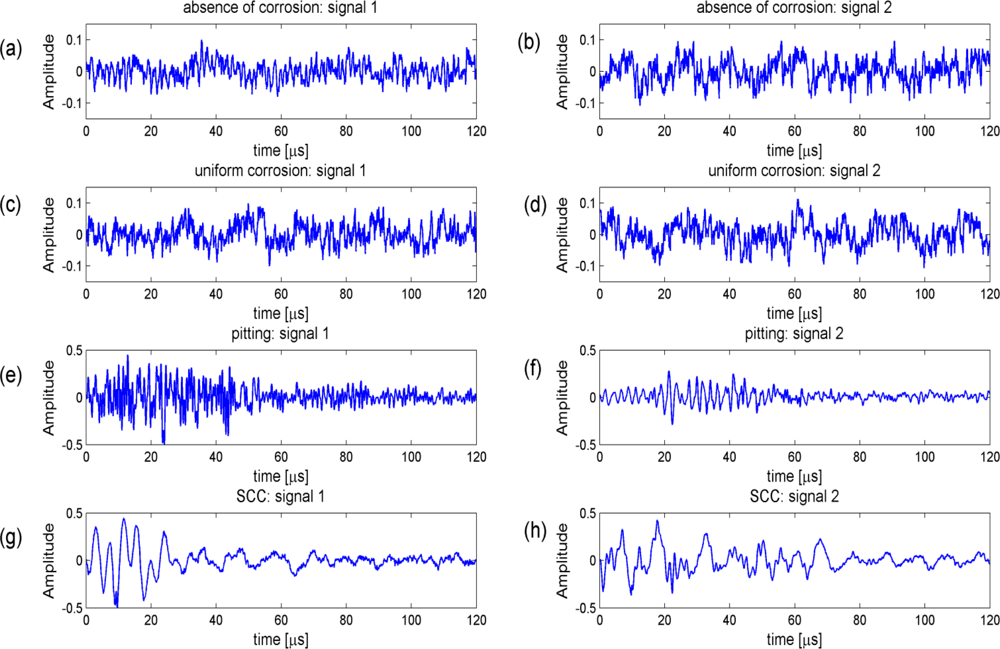 The different mechanisms that lead to the emission of acoustic events have been treated extensively in [2,6,15]. In Figure 2, we show some examples of different acoustic signals that were captured during different corrosion processes. Acoustic signals in the uniform corrosion experiments are characterized by a continuous-type acoustic emission signal [2,15], see also Figure 2(c,d). Localized forms of corrosion, such as pitting and stress corrosion cracking, lead to a burst-type acoustic activity, see Figure 2(e,f) and Figure 2(g,h) respectively.