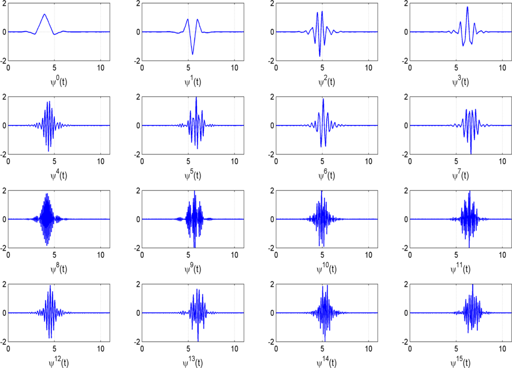 It is the parameter ‘j’ that determines the shape of the template. If we choose the 12-tap Coiflet filter [20], we obtain the first 16 different templates Ψ0(t), Ψ1(t), Ψ2(t),... Ψ15(t) shown in Figure 3. This 12-tap Coiflet filter has been consistently used in the experiments in Section 5. The construction of these basis functions can be found in text books [27]. The shapes of these basis functions also motivate the use of wavelet packet decompositions in our application. With an appropriate scaling and time shift some of the basis functions in Figure 3 resemble the AE bursts in Figure 2 (e–h). Choosing the appropriate template, the scaling factor and the time shift is the task of the feature selection procedure in Section 4.