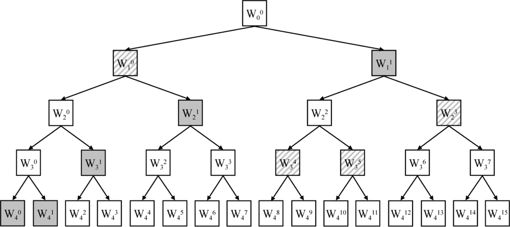 Figure 4. Library of wavelet packet functions. Different subspaces are represented by Wij. Index ‘i’ is the scale index, index ‘j’ is the frequency index. The depth ‘I’ of this tree is equal to 4. Every subtree within this tree, where each node has either 0 or 2 children, is called an admissible tree. Two admissible trees are emphasized, one shaded in grey and one marked with diagonals.