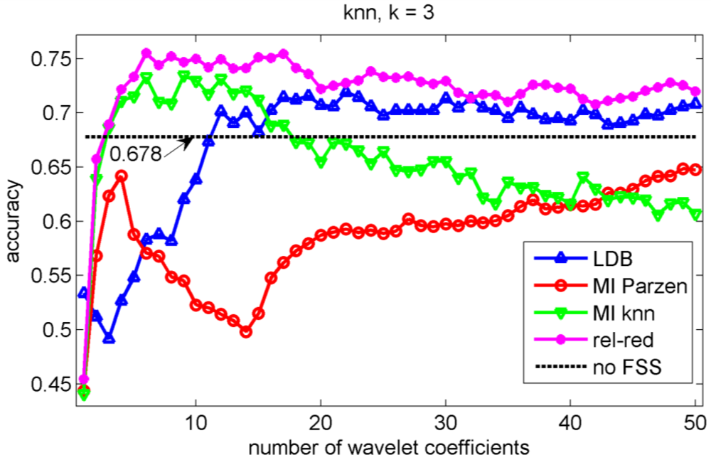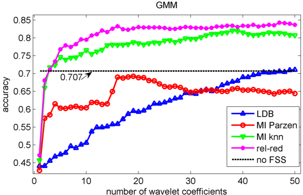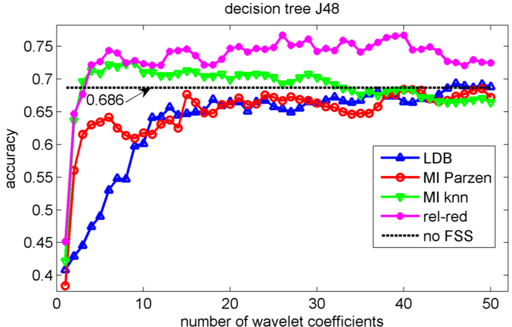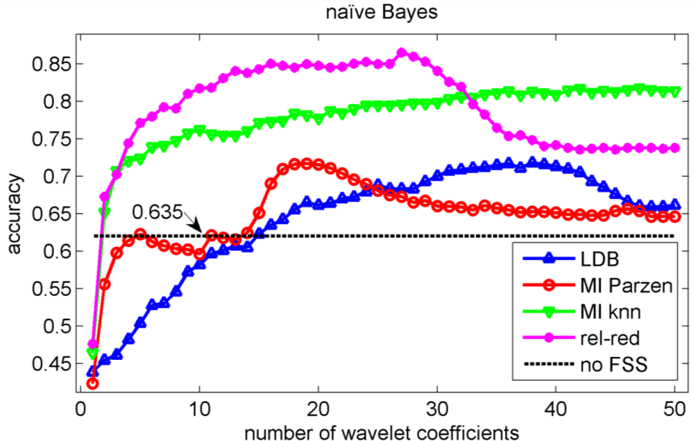Comparison of Figures 5, 6, 7 and 8 reveals that the relevance-redundancy criterion for wavelet coefficient selection results in the highest classification accuracies. In fact, it is almost always better, no matter how many wavelet coefficients are selected, and no matter which classifier is chosen. The MI knn approach can be regarded as second best, because it is almost always better than the LDB algorithm and the MI Parzen approach in case of the decision tree, Gaussian mixture model and naïve Bayes classifiers. Note also that the performance of the relevance-redundancy approach is higher than the case when no feature subset selection (no FSS) is applied. Indeed, e.g., in Figure 8 the performance of the relevance-redundancy approach is higher than the ‘no FSS’ approach as soon as two features have been selected. In case no feature subset selection is applied, the whole signal, i.e., all 1,024 time samples for each signal, are used to train the classification algorithms and to perform the predictions. The observation that a subset of features may lead to higher classification accuracies compared to the whole signal can be related to the ‘curse of dimensionality’ [34]. A part of the explanation lies in the fact that when using more features, more parameters need to be estimated for the classification algorithms based on the same finite training sample size. These parameters can only be estimated with limited accuracy, and this in turn increases the classification error. Furthermore, when using all 1,024 time samples possibly many noisy samples are included which could corrupt the prediction accuracy. One of the purposes of feature selection is to select those features from which good predictions can be generated, and ignore the noisy ones.