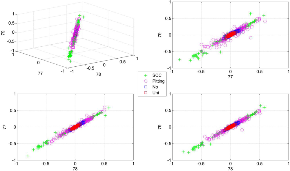 Note the slower increase in accuracy for the LDB algorithm compared to the mutual information approaches that can be observed in Figures 5 to 8. This is related to the fact that the LDB algorithm ignores dependencies between the wavelet coefficients. In fact, the selected wavelet coefficients are highly redundant. In each of the training folds of the 10 fold cross-validation, the local discriminant basis selection algorithm selected subspace W00 as the most discriminative basis. Although the coefficients in this subspace provide discriminative information between SCC (largest values), pitting (intermediate values) and uniform corrosion + absence of corrosion (these two classes have the smallest values), the LDB algorithm was misled by the high dependencies that are present in subspace W00. Indeed, in the scatter plot of Figure 9, it can be seen that the first three features, which occurred most often as a triplet in the 10 training sets of the 10 fold cross-validation, are in fact highly dependent. Each one of the three coefficients provides about the same discriminative power, so adding up their discriminative powers to obtain the joint discriminative power is misleading. The highest accuracy achieved with the LDB algorithm is obtained for the k-nearest neighbor classifier using 22 wavelet coefficients: 71.9%.