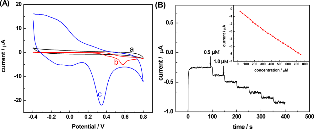 Figure 1(A) shows the cyclic voltammograms of the bare and MWNT-CHIT modified electrodes in 5 mL tris-HCl buffer solution (pH 7.5) containing 0.5 M NADH recorded with a scan rate of 10 mV s−1. No peak was observed with a bare GCE (curve a) without adding NADH. Upon the addition of NADH, the oxidation resulted in an oxidized peak with the anodic potential of +0.6 V vs. SCE at the bare GCE (curve b), whereas the modified electrode exhibited a dramatic enhancement in the peak value of NADH oxidation at 0.32 V (curve c).