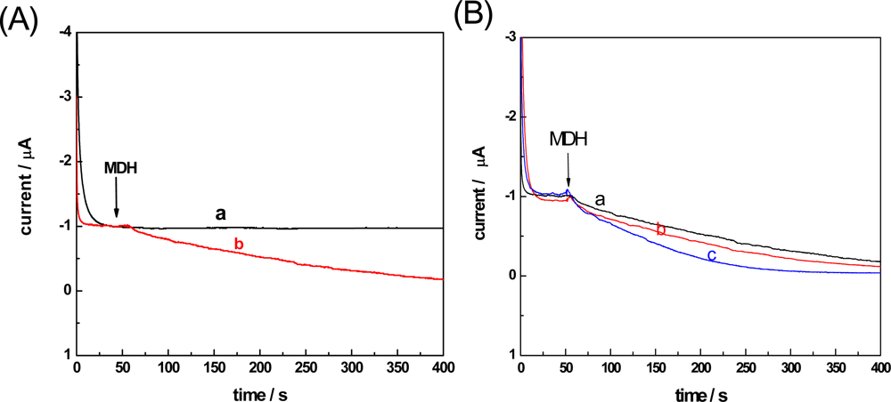 The cyclic voltammogram recorded at the modified electrode in 1M oxaloacetate +1 M NADH + 100 M Tris-HCl buffer (pH 7.5) showed that the peak potential of NADH oxidation was 0.32 V. Thus, in our amperometric i-t experiments, a potential of 0.32 V was set and the amperometric i-t curve was recorded, as shown in Figure 2(A). It is clear that there is no obvious current change without adding MDH [Figure 2(A)-a], whereas with the addition of 10 μL MDH (10 mg mL−1) to the assay solution, the anodic oxidative current of NADH gradually decreased [Figure 2(A)-b], which means that the MDH catalytic reaction started and finally reached reversible equilibrium. It is, therefore, evident that the amperometric i-t technique using the MWNT-CHIT modified electrode could accurately determine the MDH activity in an enzymatic catalytic reaction by tracing the decreasing NADH oxidation current.