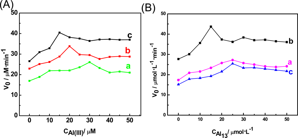The effects of Al(III) and Al13 on the v0 of the oxaloacetate reduction reaction catalyzed by MDH at different pH values were examined successfully by the amperometric i-t curves. As shown in Figure 3(A,B), the activation effects of Al(III) and Al13 reach a maximum level with the increase of Al(III) and Al13 concentration, while the maximum points were different at various pH values. The possible reason is that Al(III) and Al13 may exist in various speciations at different pH values, and they display different biological effects on MDH. As shown in Figure 3(A), at pH 6.5 Al(III) displayed the strongest effect on MDH activity, and the effect was reduced as the pH increased. The differences of the Al(III) effect with pH may be due to fact that the Al(III) speciation gives forms that interact more effectively with the MDH enzyme and become dominant at lower pH. It is worth noticing that unlike those of Al(III), the activating effects of Al13 were highest at pH 7.5 [Figure 3(B)]. The phenomenon could be explained that the fact the stability of Al13 varied with pH. While Al13 is stable at pH 7.5, it may be depolymerized at pH 8.5 and 6.5.