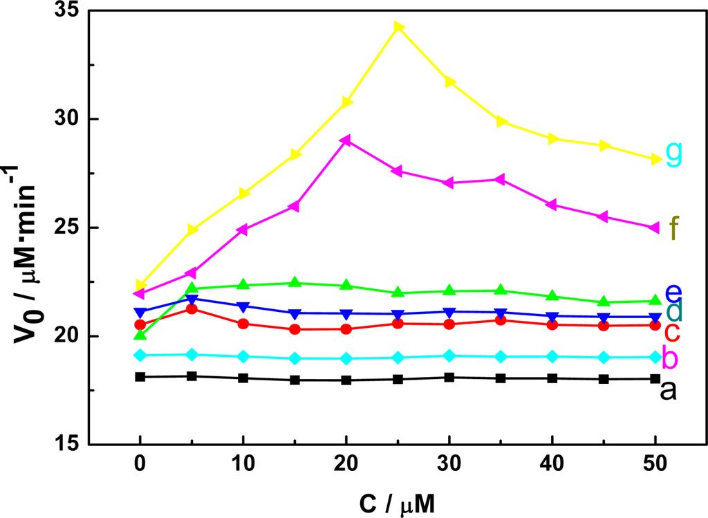 In our previous investigation, we examined the effects of Al(III) and nano-Al13 species on the activity of glutamate dehydrogenase (GLDH) by electrochemical methods using a functionalized MWNT-GCE. It is weel known that electrochemical analysis is a powerful tool to trace metal ions and biomolecules in biological systems with a number of remarkable advantages such as high sensitivity, faster and more reliable results, simple instrumentation and operation procedures and lower cost. In the past few decades, the analysis of enzymes by electrochemical methods has been reported. Gao and Xin [34] studied the effects of lanthanide ions on the kinetics of GLDH by a chronoamperometric method using a bare glassy carbon electrode (GCE). Bi et al. investigated the effect of Al(III) and Al13 on the activity of LDH by differential pulse voltammetry using a hanging mercury drop electrode (HMDE) [35]. Yang et al. have reported their electrochemical studies on the inhibition and activation effects of Al(III) on the activity of bovine liver GLDH with HMDE [36]. In recent years, more and more researchers have turned their attention to the application of modified electrodes in biochemistry for their excellent catalytic properties. Zhuang et al. [37] have explored the electrochemical properties of unfunctionalized single-walled carbon nanotubes (SWNT) as nanometer-sized activators in enzyme-catalyzed reactions and experiments showed that the modified electrodes could be successfully used to monitor the activity of LDH.