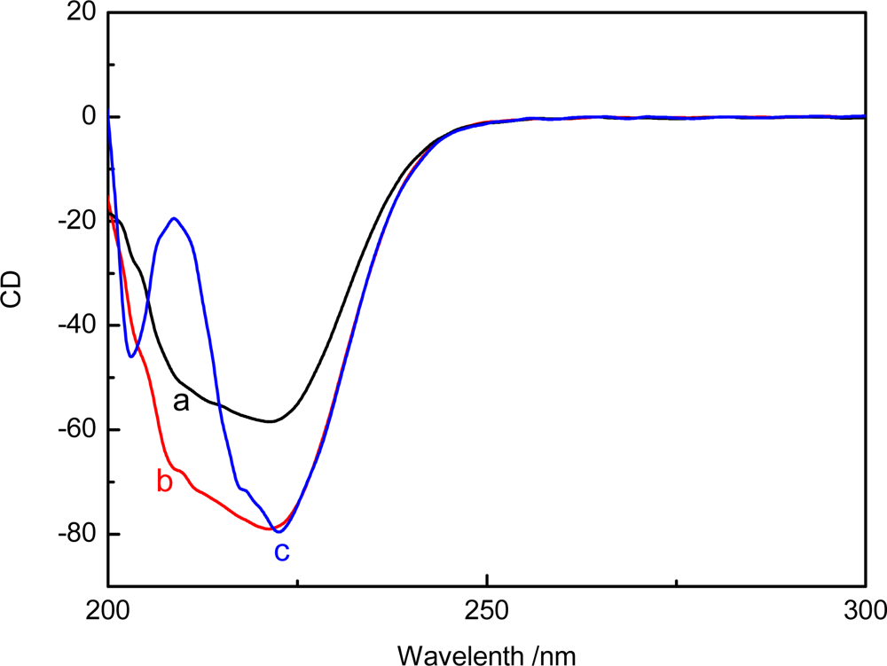 On the other hand, the conformational change of MDH caused by the direct interaction of Al(III) and Al13 to MDH would contribute to the activating effect. To further explore the conformational change of MDH, circular dichroism (CD) was used to indicate that the binding of aluminum to the enzyme would induce a transformation between α-helices and β-sheets and random coils, which results in a change of enzyme activity. The CD spectral of MDH undergoes a rapid change in the presence of Al(III) and Al13, as shown in Figure 5. We can observe a increase in the CD spectra intensity of MDH in the far-UV region upon addition of Al(III) (curve b), which indicates an alteration in the secondary structure of the enzyme. It is well known that the split-hump in the far-UV region is the typical spectrogram of the α-helix structure of proteins [49], so the appearance of a split-hump in the far-UV region in the CD spectra of MDH upon addition of Al13 indicates that the presence of Al13 could increase the amount of α-helix structure of MDH, which may make it more easy for the substrate to access the active site of the enzyme.