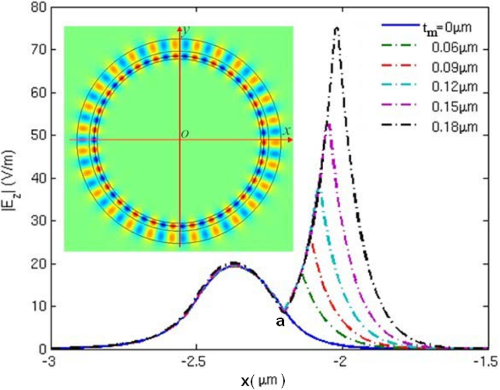 To reveal the mechanism behind these phenomena, we plotted the electric field distribution along the x axis from −3 μm to −1.5 μm for mode 27, as shown in Figure 10. Point “a” in Figure 10 is the inner boundary of the microring resonator. When the metamaterial layer is loaded onto the inner side, inner boundary of the metamaterial sensor shifts to the right side and shown at the peak of the dashed lines in Figure 10. Permittivity and thickness of the adsorbed substance is set to be ɛs = 1.02, t = 0.075 μm. It is seen that the electric field intensity increases with metamaterial layer thickness (tm). The inset shows the electric field distribution of the metamaterial sensor of tm = 0.12 μm. From Figure 10, we can clearly observe that the stronger electric field of evanescent wave penetrates into the detecting region when the thickness of metamaterial layer increases. Therefore, the amplification of evanescent wave is the essence for the improvement of sensitivity.