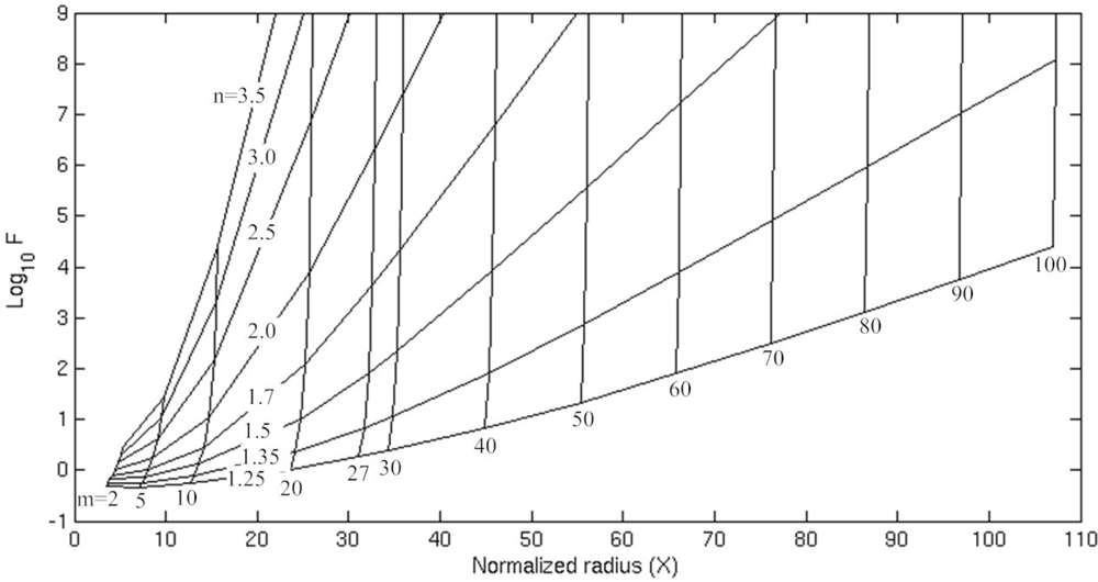 In order to estimate the radiation-loss-limited Q factors of WGMs [28,29], complex frequencies of the resonances ω = ω′ + jω″ were introduced into the dispersion equation. The real part ω′ determines the wavelength of the resonances and the Q factor can be estimated with the expression: Q = ω′ /2ω″. This dimensionless parameter generalizes the imaginary part of the solution space. In order to generalize the real part, a normalized radius is defined as X = n22πb/λ. To solve for the complex roots of the dispersion equation |M|= 0, a global optimization scheme can be used to minimize the absolute value of the equation over two variables: Q and X. Figure 2 displays the radiation-loss-limited finesse (F = Q/m) vs. normalized radius for a variety of azimuthal mode numbers and index ratios. The family of diagonal lines represents varying refractive index contrast (n = n2 /n1). The family of nearly vertical lines corresponds to WGM resonances, each characterized by an azimuthal mode number m. From Figure 2, we can observe that the radiation-loss-limited finesse increases with normalized radius and mode number. Besides, for a give normalized radius and mode number, the radiation-loss-limited finesse increases with the refractive index contrast. These results are beneficial for designing a microring resonator. In the following section, we will simulate the microring resonator and compare its resonant frequencies with the analytical results. Then, the metamaterial sensor constituted by the microring resonator with a layer of metamaterial loaded into its inner side and coupled to a straight waveguide is studied.