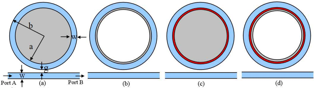 Simulation models of the microring sensor are illustrated in Figure 3. Figure 3(a) shows the conventional microring sensor with a dielectric core. It is denoted as Model A in the following simulation. The width of the ring and the waveguide is w = 0.3 μm. The inner and outer radius of the ring is a = 2.2 μm and b = 2.5 μm. The distance from outer ring to the waveguide is g = 0.232 μm. The refractive index of the ring and the waveguide is n = 3.2. Figure 3(b) shows another simulation scenario, of which the dielectric sample is attached to the inner side of the microring. It is denoted as Model B. Figure 3(c) is the simulation model of the proposed metamaterial sensor that is constituted by the microring with a metamaterial layer attached to the inner side. The dielectric core is colored in grey. It is denoted as Model C. In Figure 3(d), the dielectric sample is attached to the inside of the ring adhere to the metamaterial layer. It is denoted as Model D. The permittivity and permeability of the metamaterial layer is ɛr = μr = −1. In what follows, we will simulate the performance of the traditional microring sensor and the metamaterial sensor with the help of the commercial software COMSOL multiphysics.