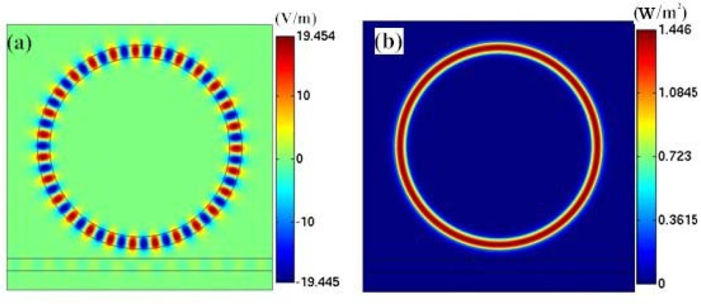 Next, a layer of metamaterials with thickness of 0.09 μm is loaded into the inner side of an air-core microring to build the simulation model of the metamaterial sensor (Model C). Simulation results of the electric field pattern, power flow and resonant frequency spectrum of the metamaterial sensor are illustrated in panels (a), (b) and (c) of Figure 5. In this case, the maximum electric field is located in the metamaterial layer where the power flow intensity is then rather strong. A comparison between metamaterial sensor and the microring sensor is shown in Table 3. It is seen that a thin layer of metamaterials loaded into the inner side of the microring doesn’t affect the high-Q performance of the microring resonator, and has little influence on the resonant frequency. Since the maximum electric field is permeated into the metamaterial layer, this region will be very sensitive in a dielectric environment. In what follows, we investigate the performance of the metamaterial sensor in a dielectric sensor and compare it with that of the microring sensor.