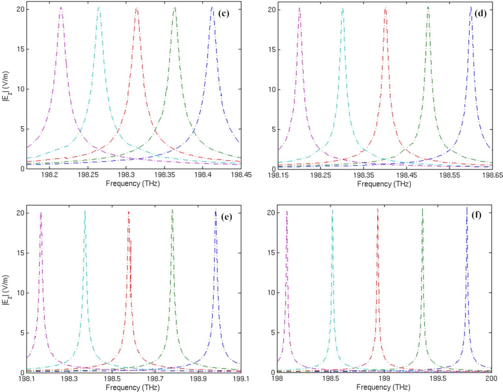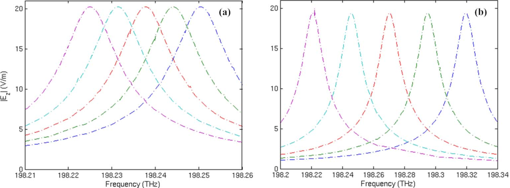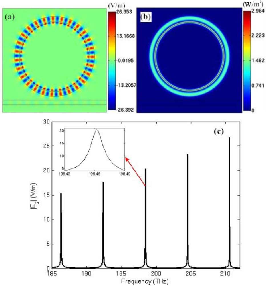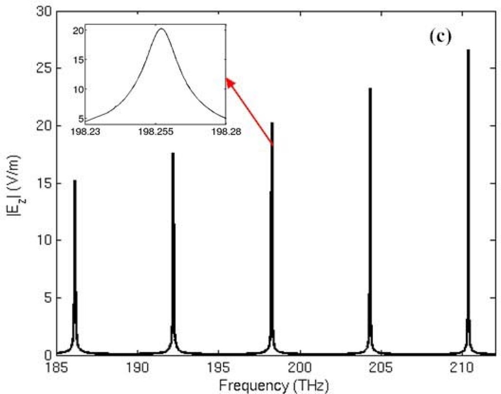 From left to right, the spectral lines represent mode 25, 26, 27, 28 and 29 of the microring resonator. The inset portrays the amplification in the frequency range of 198.23–198.28 THz. The resonant frequency of the microring is calculated and compared with the theoretical results, as shown in Table 2. The good agreement between the simulation results (fs) and the theoretical results (ft) confirms the effectiveness of the numerical simulation.