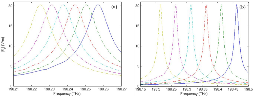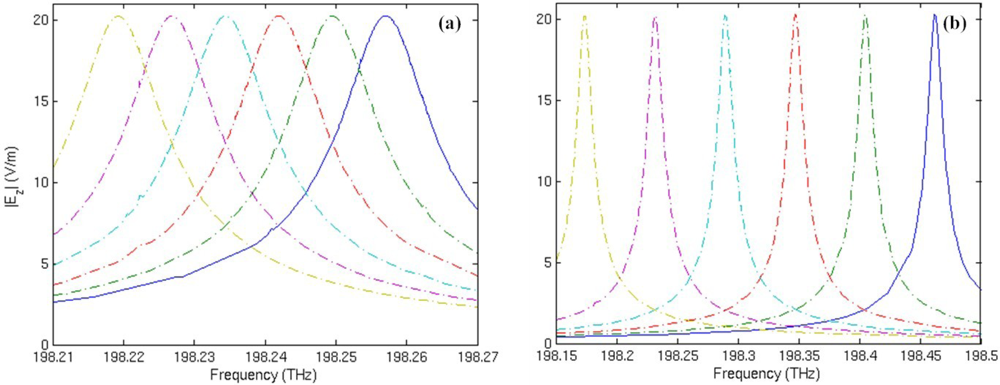 Figure 6 shows the spectrum shift of mode 27 with respect to the change of core medium permittivity ɛs. In the simulation, ɛs is supposed to vary from 1 to 1.1 with an interval of 0.02. It is found that with the increase of the core medium permittivity, the resonant frequency always shifts to the decrescent direction. Comparing Figure 6(a) with Figure 6(b), we can clearly observe that the response to an increase of 0.02 in core medium permittivity is a frequency downshift of 7.58 GHz on average for the traditional microring sensor; for the metamaterial sensor, the average frequency shift is 57.82 GHz. Therefore, sensitivity of the metamaterial sensor is 7.6 times that of the traditional microring sensor for volume sensing.