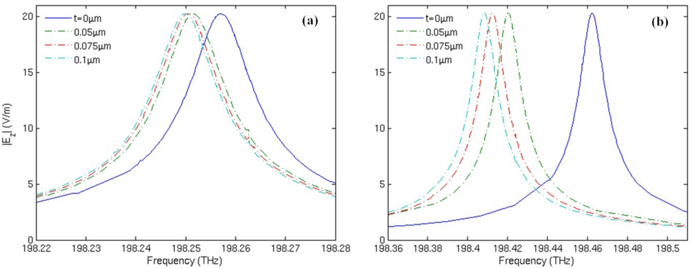 Figure 8 shows the spectrum shift of mode 27 with respect to the increase of substance layer thickness t, which represents the adsorption or attachment of molecules. Permittivity of the substance layer is set to be 1.02 in the simulation. From Figure 8(a), we can see that when t increases from 0 to 0.05 μm, the frequency shift of the traditional microring sensor is 5.53 GHz; the increase of t from 0.05 μm to 0.1 μm with an interval of 0.025 μm results in a frequency downshift of 0.81 GHz in average. For the metamaterial sensor, a frequency shift of 42.18 GHz is induced by the increase of t from 0 to 0.05 μm, as shown in Figure 8(b). Besides, the increase of t from 0.05 μm to 0.1 μm with an interval of 0.025 μm results in a frequency downshift of 5.96 GHz in average, with is about 7.3 times that of the traditional microring sensor. Therefore, the metamaterial sensor possesses much higher sensitivity than the traditional microring sensor.