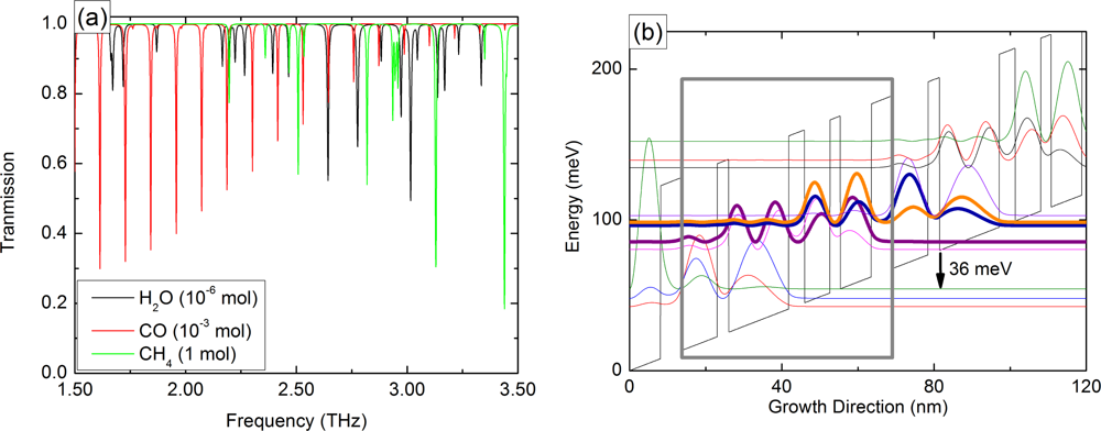 The THz spectral region covers frequencies from 1 to 10 THz or, in terms of photon energy, 4 to 40 meV. It is a chemical fingerprinting region, making it highly interesting for sensors. The energy of rotational and vibrational transitions of molecules lies within this frequency range, leading to characteristic resonances. Therefore, it is easy to distinguish different molecules by their optical absorption. A transmission spectrum of methane, water vapor and carbon-monoxide is presented in Figure 1(a). The different absorption lines for each molecule are clearly visible. The same scheme can also be used to detect liquids [] and solids, e.g., explosives [,]. Furthermore, THz radiation is not ionizing due to the low photon energy. Medical diagnostics is therefore showing a growing interest in the THz range, e.g., cancerous tissue can be identified [].