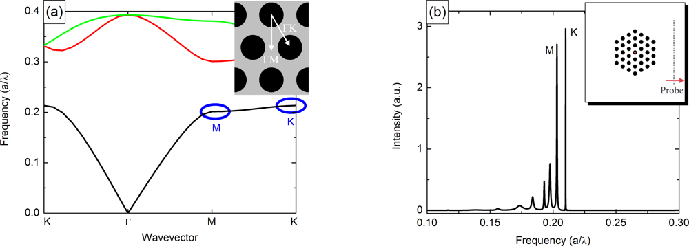 The PhC used in this work is an array of isolated pillars surrounded by air. The pillars are arranged in a hexagonal lattice, a schematic is illustrated in the inset of Figure 2(a). This type of PhC shows full bandgaps for TM-polarized light [], the polarization emitted by QCLs. The pillars are modeled with a ratio r/a of 0.3, where r is the pillar radius and a the PhC period. The refractive index is set to 3.65, a measured value for GaAs in the THz regime []. A calculated bandstructure for the PhC used in our devices is presented in Figure 2(a). The flat regions at the M and the K-point can be used as the lasing modes. The wide, forbidden bands around the high symmetry points ensure a stable single mode emission.