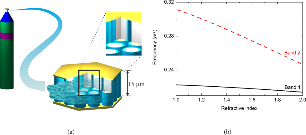 The dimensions of the structure are on the order of typical microchannels []. The large, open space between the individual pillars is essential for the sensor application, as it allows for a free propagation of the gas through the resonator. The injected gas changes the resonance condition of the PhC. The expected frequency variation as a function of the refractive index is illustrated in Figure 3(b). As the figure of merit we use the theoretical sensitivity S′ = −1/f df/dn, where f is the frequency and n the refractive index. This allows us to compare our sensor to published devices across different frequency regimes. Calculation yield a S′ of 0.025 for Band 1 [], which is comparable to PhC gas sensors in the visible []. The sensitivity can be improved drastically if higher bands are used. Simulations show that Band 2 has an increased S′ by one order of magnitude, as illustrated in Figure 3(b).