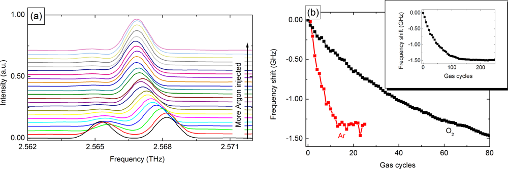 The injected gas builds a thin ice film due to the low heat sink temperature of the THz-QCL. The reduction in the refractive index contrast between the pillars and the surrounding medium leads to a red-shift of the emission frequency. A series of measured spectra for argon with increasing gas concentration is presented in Figure 4(a). The line shift from its original position for argon and oxygen is illustrated in Figure 4(b). An almost linear tuning is achieved for both gases. For higher concentrations a saturation of the frequency shift appears. The lower saturation concentration of argon is an effect of its higher atomic mass, which enhances deposition to cold surfaces [].