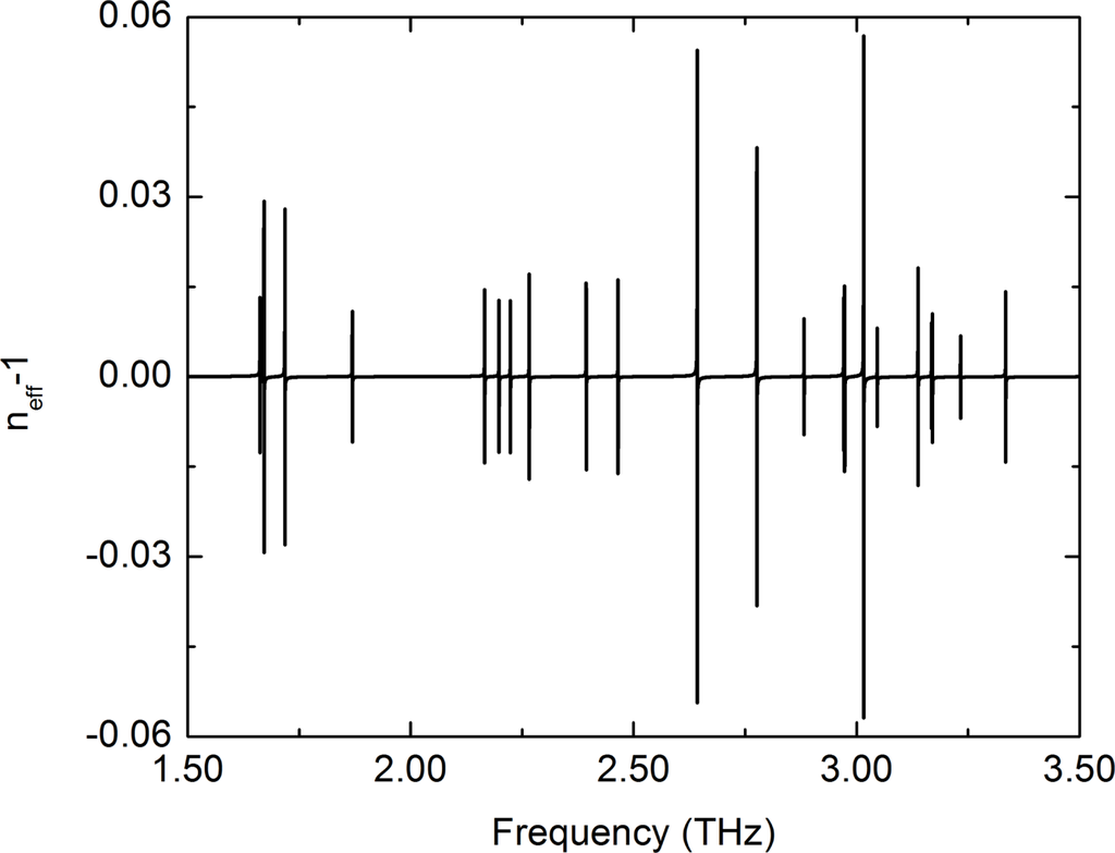 The bid advantage of this sensor concept is its simplicity and potential selectivity. It is an electrically pumped, active sensor. There is no need to couple light into a high-Q cavity. The information is encoded in the line position and not in an absolute intensity. The frequency change happens instantly with variations of the gas concentration and is fully reversible. Due to the realization in the THz frequency region, it is possible to make full use of the chemical fingerprint of different molecules. The emission frequency of the bare laser is defined purely by geometry []. Therefore, it is easy to design it close to an absorption line. This sharp absorptions lead to an noticeable index change only in a narrow frequency range. Far away from such a resonance, the refractive index is unchanged. The sensor can be sensitive to only one molecule within a mixture of unknown gases. The refractive index of water vapor at 10 mbar is presented in Figure 5 as an example.