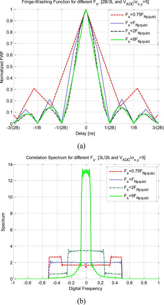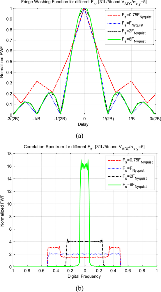 Figure 9 shows the impact on the quantized correlation of different sampling frequencies. The considerations for these plots are a 2 quantization levels scheme, a noise equivalent band-pass bandwidth of 2B (assuming a band-pass signal), and VADC = 5σx,y, taking into account the previous considerations about the spectrum replicas. Figure 9(a) shows the deformation of the fringe washing function for a set of sampling rates. The sub-Nyquist sampling (Fs = 0.75 FNyquist) has the largest deformation: it is wider, sharper than the rest of them, and the side lobes are higher.