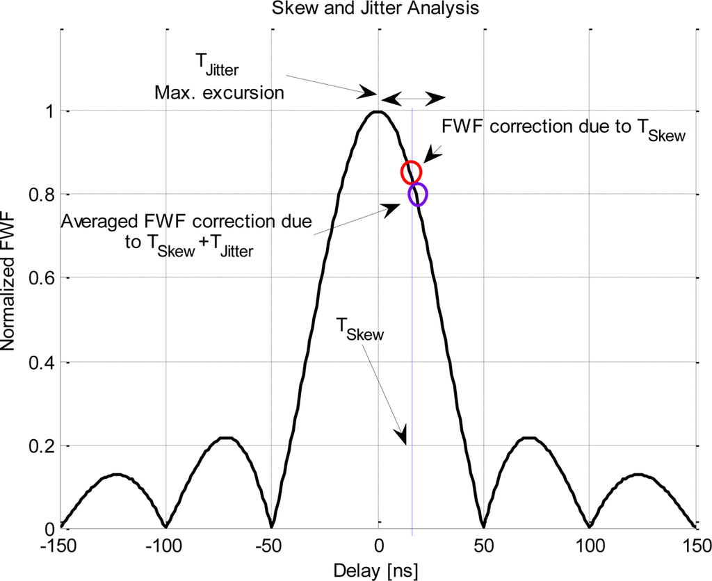 Figure 11 shows the effect of these inaccuracies, that can be summarized into skew (TSkew), which is the delay offset between the sampling time of x and y, and jitter, which is the time fluctuation above the mean value (TJitter). The impact of the skew is changing the point where the FWF is evaluated and a phase rotation of the correlation coefficient if the working frequency is not exactly zero. Meanwhile, jitter creates a perturbation for each correlation sample around the mean point with zero mean.