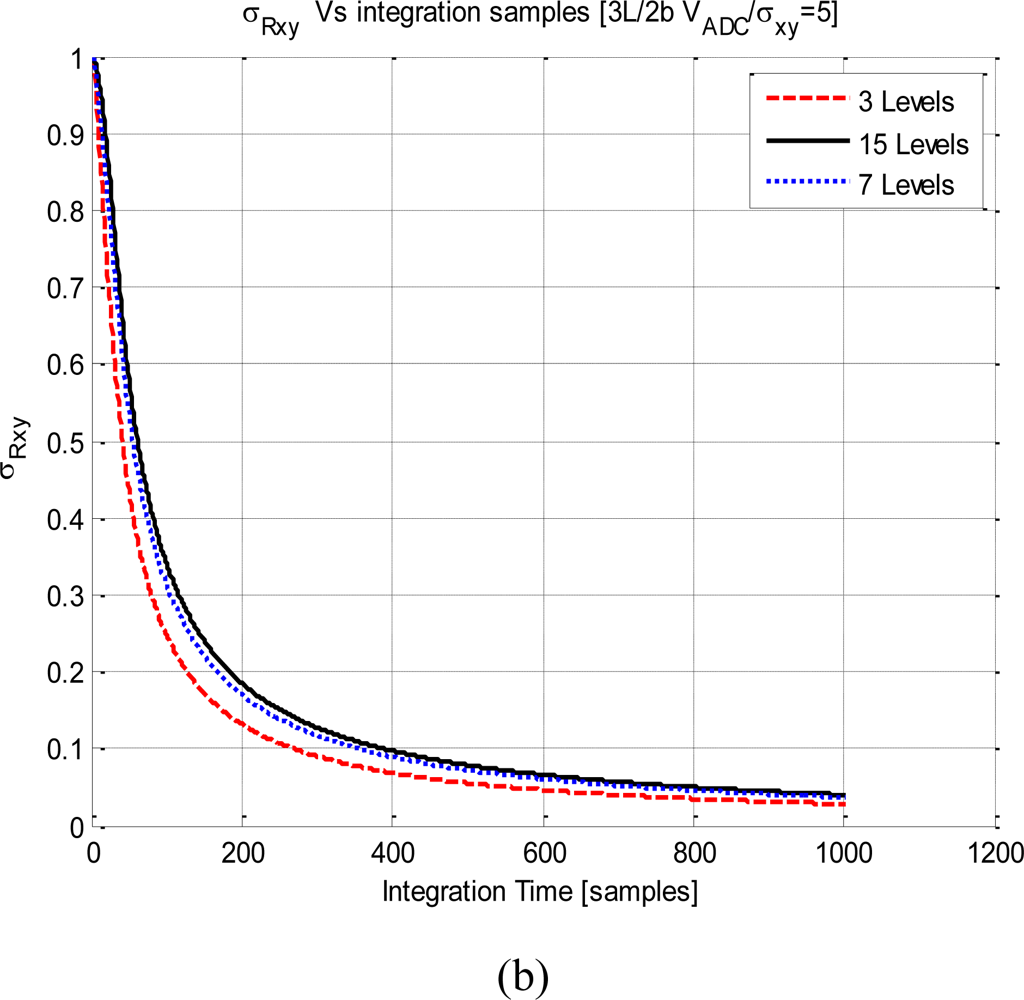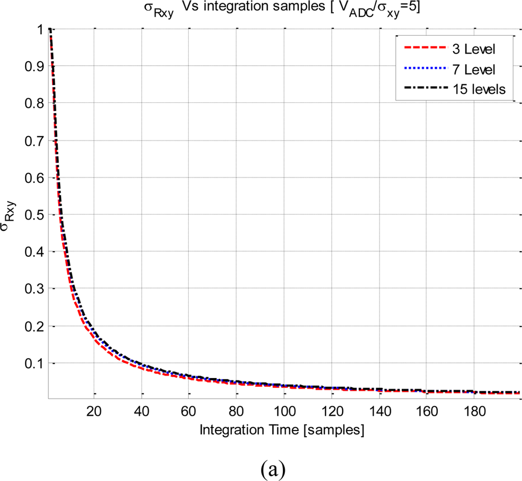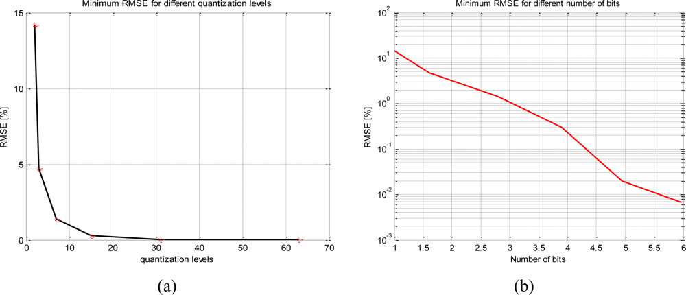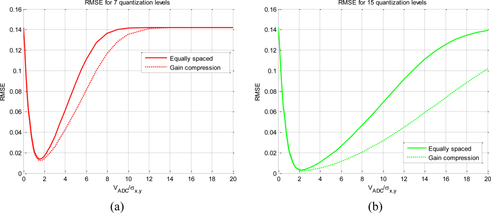 Table 1 shows that the two-level quantization scheme is not sensitive to the VADC/σx,y relationship and the RSME is always 14.2% and, on the other hand for 31 levels the relationship between quantized and ideal correlation is almost linear. Furthermore, as the number of levels increases the minimum RMSE decreases exponentially (Figure 4) and it occurs at a higher VADC/σx,y ratio.