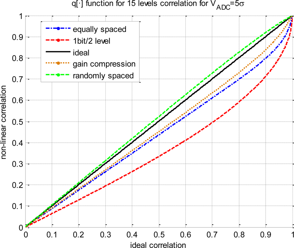 Figure 2 has been obtained from Equation (12) for several quantization schemes. Two q[·] functions are plotted for reference, the coarsest quantization scheme (i.e., 2 levels/1 bit, Equation (13)), and the ideal one (i.e., infinite levels, Rxy(τ) = ρxy(τ)). Three more functions are shown considering an ADC span window of 5σx,y (VADC = 5σx,y), 15 quantization levels or 3.9 bits (log215 = 3.9, note that it is not necessary to have an integer number of bits), but changing the non-linear function. Several g(x) functions have been considered such as equally spaced levels, using gain compression modeled by an hyperbolic tangent (g(x) = tan (x)) or having randomly spaced levels. All results are different from the others, showing the need of a deeper analysis.