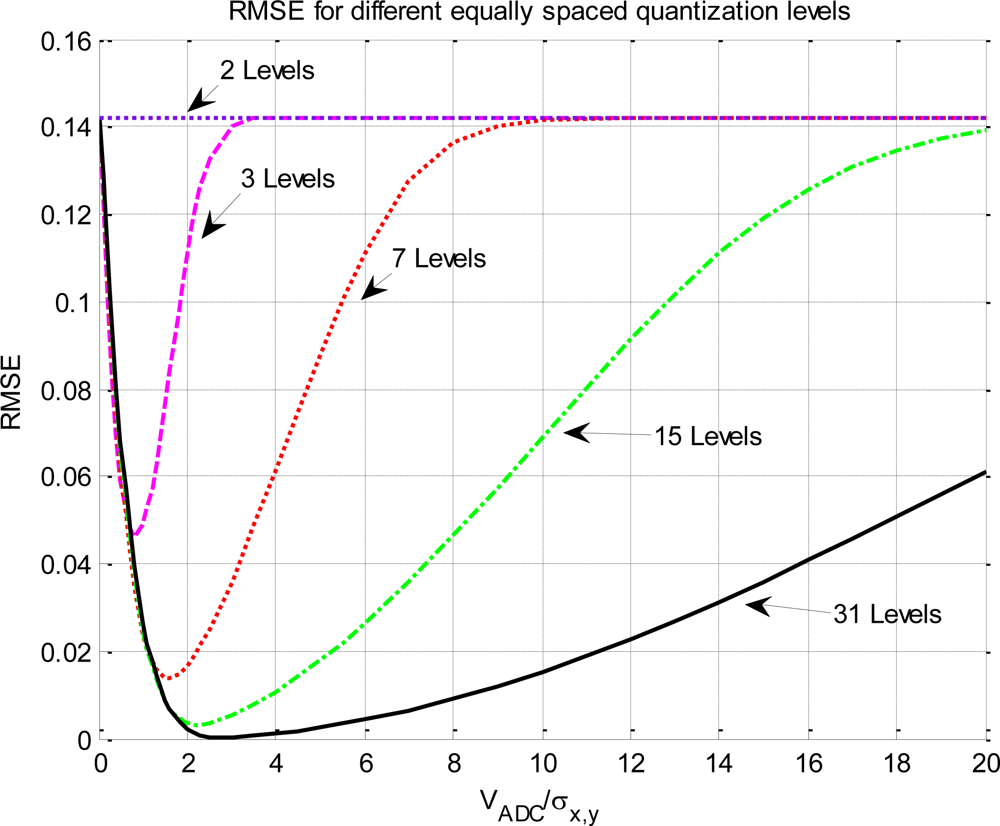 On the other hand, plots also have a common trend in the region above the minimum, where the ratio VADC/σx,y increases. As the number of quantization levels increases, the ideal and non-linear relationship (q[·]) becomes more linear over a wider range of input power (the region around the minimum widens). But when VADC/σx,y → ∞, the RMSE asymptotically increases again up 14.2% (the value of the 1 bit/2 levels) for all the quantization schemes. This effect can be understood as fewer bits are being used as the VADC/σx,y ratio increases, and it can be understood as a decreasing of the effective number of bits. The maximum effect occurs when the VADC is so spread over σx,y that only two levels are effectively used for quantization.