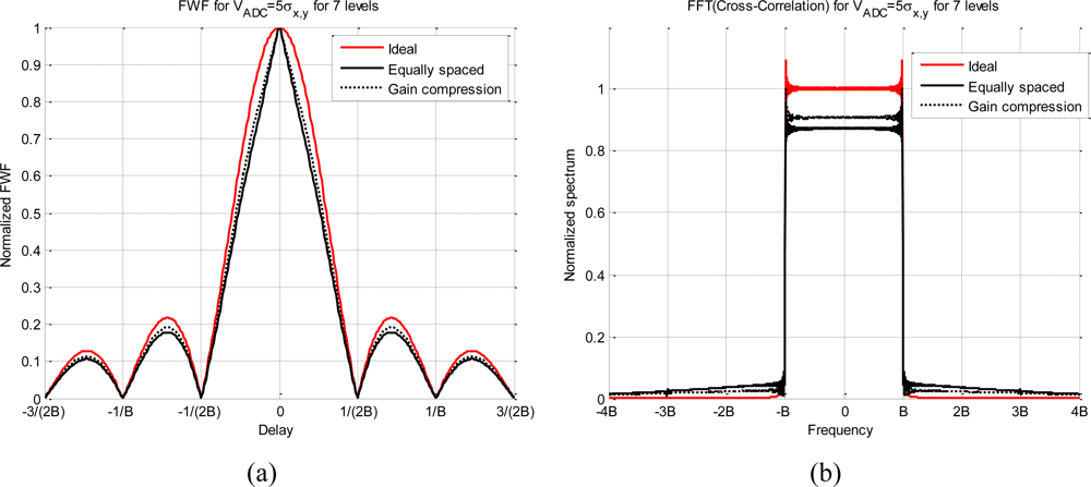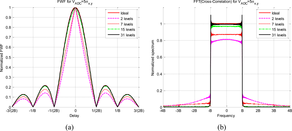 Figure 6(a) presents the x and y linear cross-correlation on the delay domain for several quantization levels. The lower the number of levels, the higher the correlation distortion. Figure 6(b) shows the corresponding spectrum of cross-correlations presented in Figure 6(a), which have been computed following Equation (15). As expected, the two-level scheme has the highest spectrum distortion, the spectrum spread increases on the rejected band and the pass-band decreases.