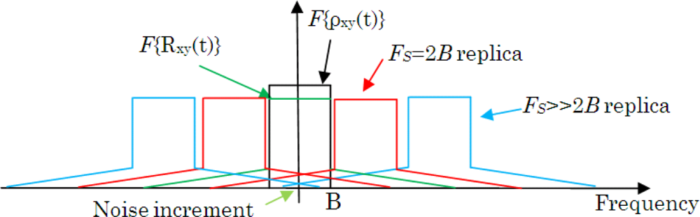 Figure 8 shows an ideal baseband spectrum with an infinite sampling frequency (F{ρxy(τ)}, in black) and a cross-correlation spectrum spread due to quantization (F{Rxy(τ)}, in green) for different Fs and its replicas [19,20]. After quantization and sampling, and further cross-correlation of the signals, the quantization tail of the Nyquist’s replica (Fs = 2B, in red) overlaps the pass-band of the baseband replica, so an extra amount of noise is included in the measurement of R̄xy, and the effect is a decrease of the calculated mean value (Equation (2)). On the other hand, the standard deviation remains constant, but the SNR decreases, which has a large impact when considering sub-Nyquist sampling.