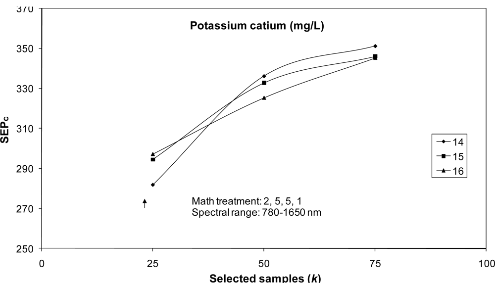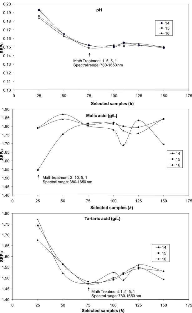 Different parameters have to be evaluated in order to optimize the LOCAL algorithm [24,25]. In the present study, for each dataset, an optimization design was set up by varying the number of calibration samples (k) from 25 to 150 in steps of 25, but including 110, for predicting SSC, reducing sugar content, pH-value, titratable acidity, tartaric acid, malic acid; and from 25 to 75 in steps of 25 for predicting potassium content in bunches; the number of PLS terms (l) was varied from 14 to 16 in steps of 1, where the number of predicted values corresponding to the first PLS terms discarded was 4. Finally, the minimum number of samples used for each calibration was set to 15.