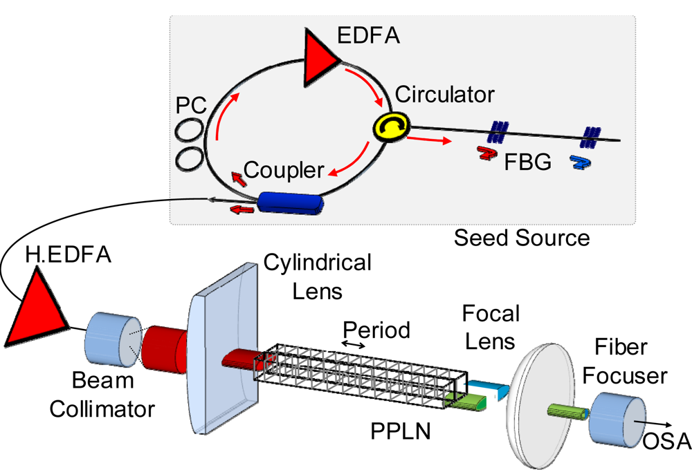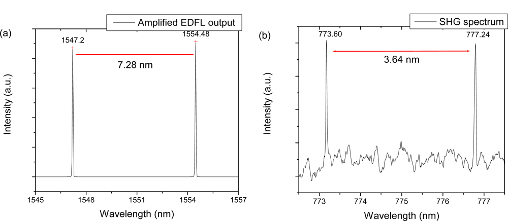 Fiber sources for near-infrared (NIR) wavelength region around 1,550 nm were rapidly developed during the last decades and are capable of producing high power single or multiple wavelengths simultaneously []. Furthermore, they are widely tunable and can be configured to produce pulses with a wide range of pulse widths and duty cycles. However, there are no relatively inexpensive comparable tunable sources around the fiber lasers’ double frequency region, ∼775 nm. Second harmonic generation (SHG) is a nonlinear optical process that generates twice the frequency of the incident light when the high intensity beam interacts with a nonlinear optical crystal. When a shorter wavelength SHG beam can be generated from a longer wavelength near-infrared fiber laser beam, it could be useful for a wide range of medical diagnostics [].