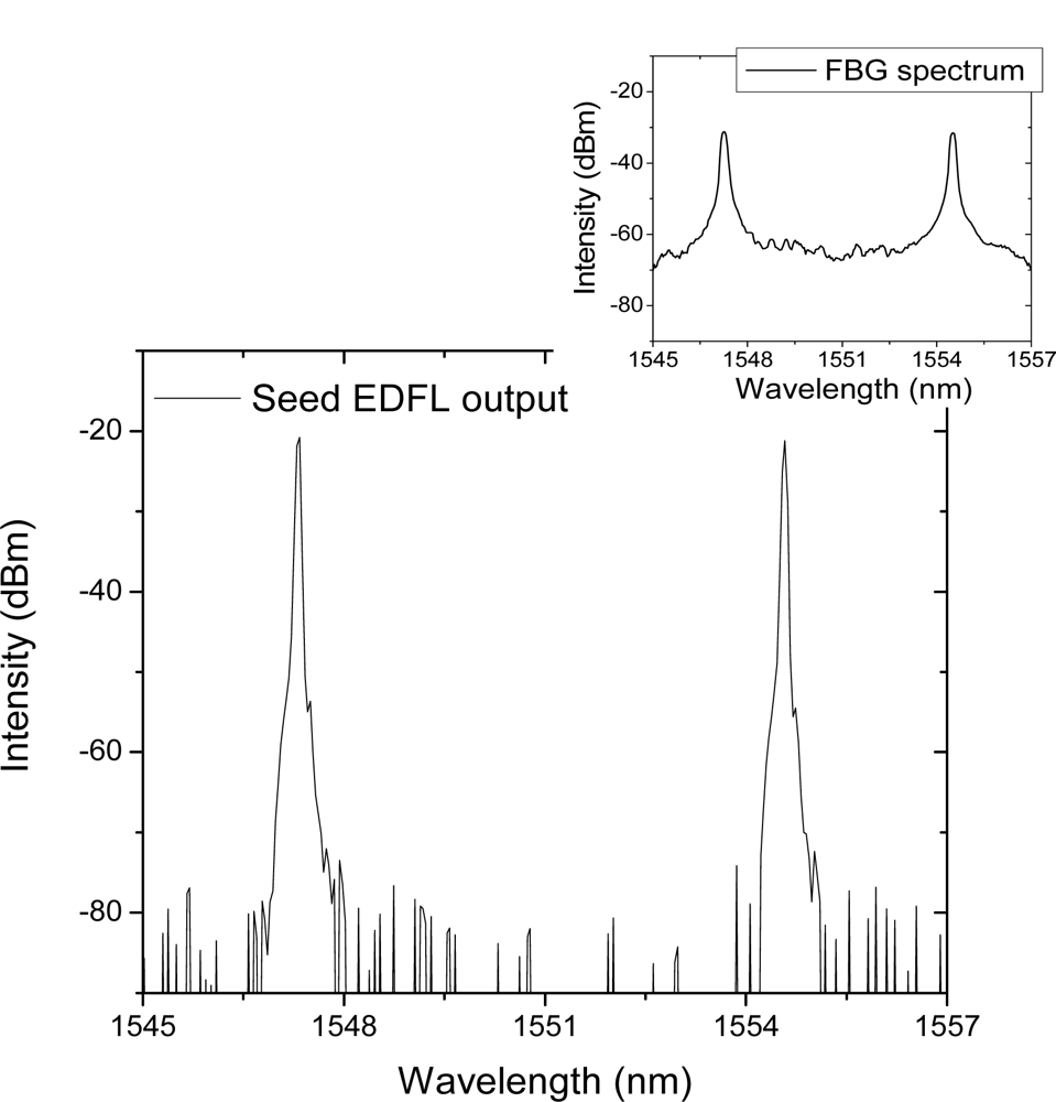 The experiment was performed with a dual wavelength Er-doped fiber laser, a high power EDFA, and two parallel PPLN channels in a temperature-controlled oven. Figure 1 shows the experimental setup. The seed source was configured with a dual wavelength ring laser system using two FBGs with center wavelengths of 1,547.20 nm and 1,554.48 nm, respectively. As shown in Figure 2, the lasing wavelengths of the seed source are exactly determined from the spectrum of two FBGs. These two lasing wavelengths can be controlled accurately within a few nm range by the external pulling stretcher on each FBG filter. The center peak wavelength of FBG is linearly shifted to a longer wavelength region when we apply a pulling strain on both end positions of the FBG component. For the high intensity input to the energy efficient CW PPLN conversion, a 33 dBm EDFA is additionally prepared at the output of a dual wavelength laser source.
