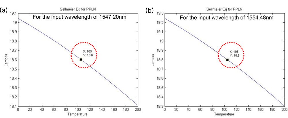 From the above relation, it is clear that there exists only one pair of input light wavelengths, λω, and PPLN periods, Λ, under a certain temperature condition, T. Thus, in order to generate two SHG wavelengths simultaneously using two adjacent PPLN periods, it is necessary to find an optimal condition such that two input wavelengths in a single light beam satisfy this quasi-phase-matching condition under the same temperature simultaneously. Compared with a conventional dual SHG configuration based on two different input wavelengths from each independent light source, this method has a relatively higher efficiency to align the input light beam into the adjacent parallel PPLN channels simultaneously. We performed a simulation in MATLAB to find this optimal condition using an iterative Sellmeier equation code. As a result, the optimal poling periods of 18.6 μm and 18.8 μm were obtained for the input wavelengths of 1,547.20 nm and 1,554.48 nm, respectively, under the phase-matching temperature of 105 °C [,]. Figure 3 shows the simulation result of this optimization process.