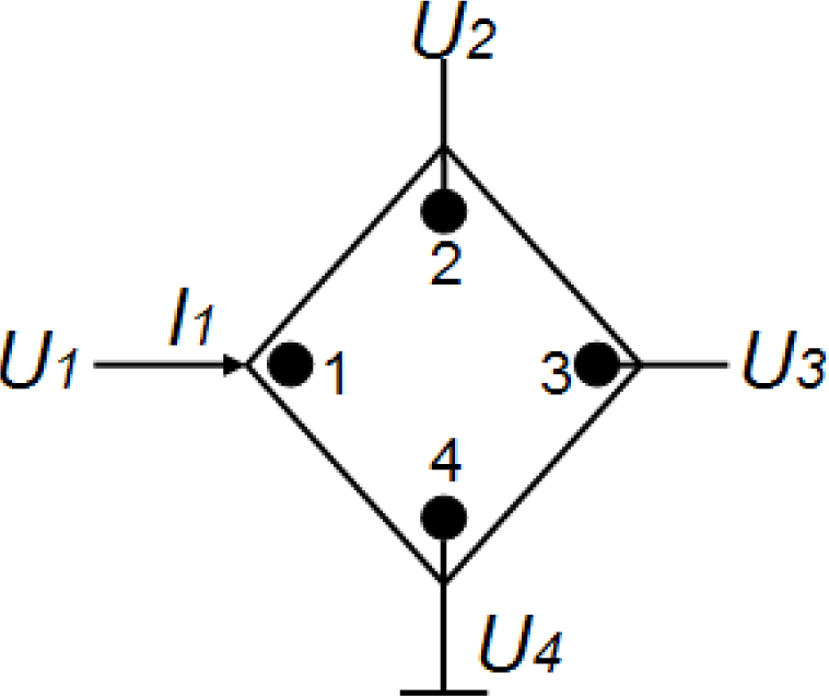 To be compatible with the spinning current techniques for reducing Hall offset [3], 90° symmetry Hall plates with square or cross-shaped structures are usually recommended. We can obtain the Z-matrix for the 90° symmetry Hall plates with four contacts illustrated in Figure 1 as follows [8]: