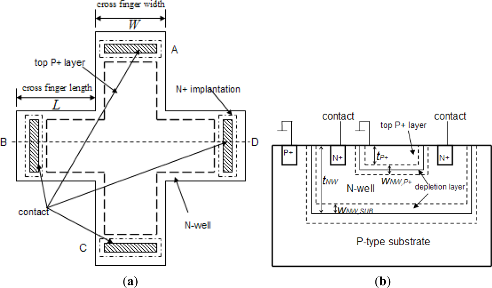 Here, ND,NW is the N-well doping concentration, teff is the effective depth of Hall plate. As shown in Figure 3(b), it is equal to: