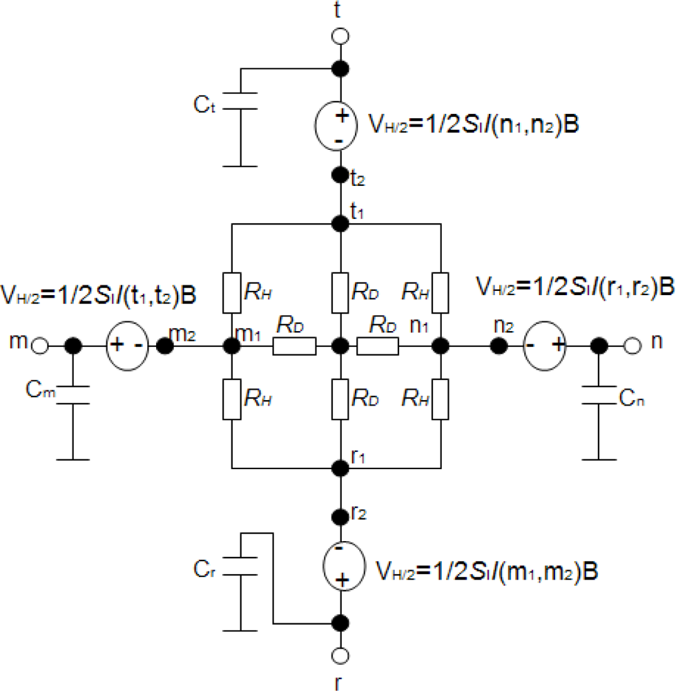 In our model illustrated in Figure 4, each Hall voltage VH/2 is modeled by using the current-controlled voltage sources with the following equation: