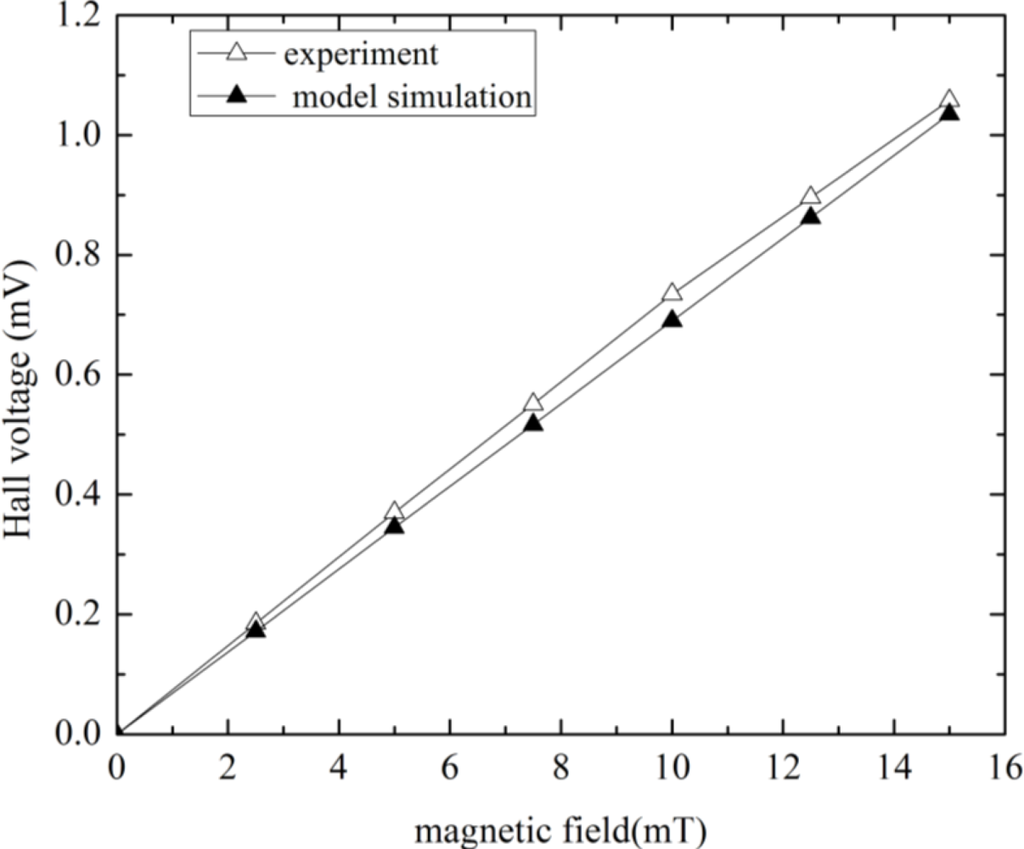 To show the correctness and accuracy of this model, the corresponding experimental results of the Hall plate fabricated using the same technology given in the literature [12] are compared with the model’s simulation results. First, we performed the simulation of Hall voltage versus magnetic field at room temperature. The simulated and test results when the input bias current is 1 mA and the Hall plate is liberated of packaging stress, are plotted in Figure 5. It can be observed that the simulated Hall voltage is proportional to magnetic field intensity. When the magnetic field intensity is 2.5, 5, 7.5, 10, 12.5 and 15 mT, the simulated Hall signal is 0.172, 0.345, 0.517, 0.69, 0.862 and 1.035 mV, respectively. While the value of the measured Hall voltage is 0.185, 0.37, 0.551, 0.735, 0.896 and 1.058 mV for the corresponding magnetic field intensity. We can see that the simulated current-related sensitivity is 69 V/AT, while the tested result is 75 V/AT. A very good agreement is thus obvious in Figure 5. If a mechanical stress in the CMOS Hall plate is estimated at σx = σy= −70 MPa for a typical plastic packaging [14], which will lead to a variation of the simulated magnetic sensitivity of about 5% at room temperature compared with the stress-free sensitivity. Secondly, the simulation of the N-well sheet resistance versus input voltage was implemented at room temperature without packaging stress influence.
