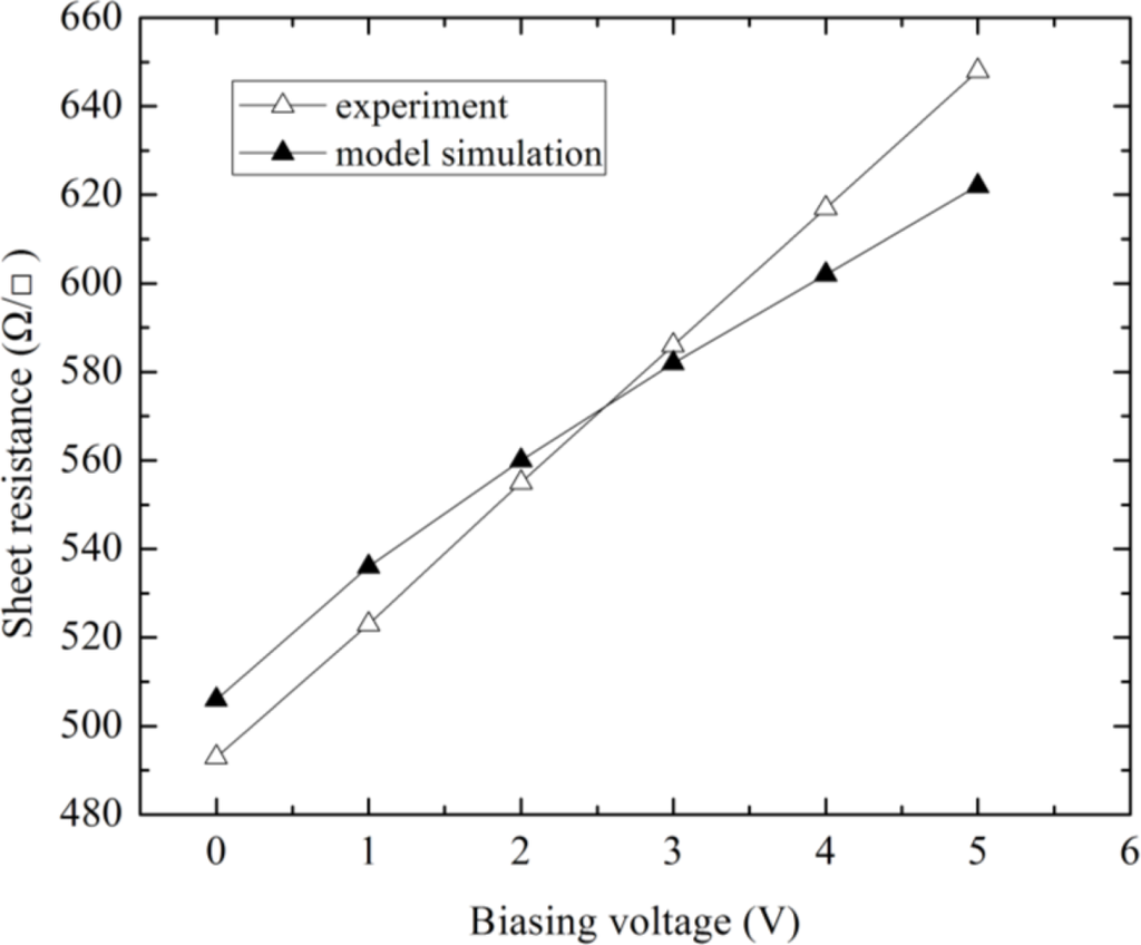 Figure 6 illustrates the comparison between the simulated and tested sheet resistances per square versus variation of input voltage (sweeps from 0 V to 5 V). The measured sheet resistance per square changes from 493 Ω/γ to 648 Ω/γ. By comparison, the simulated sheet resistance per square changes in the range (506 Ω/γ–622 Ω/γ) with a small error. In addition, the characteristics of magnetic sensitivity vs. temperature drift were simulated.
