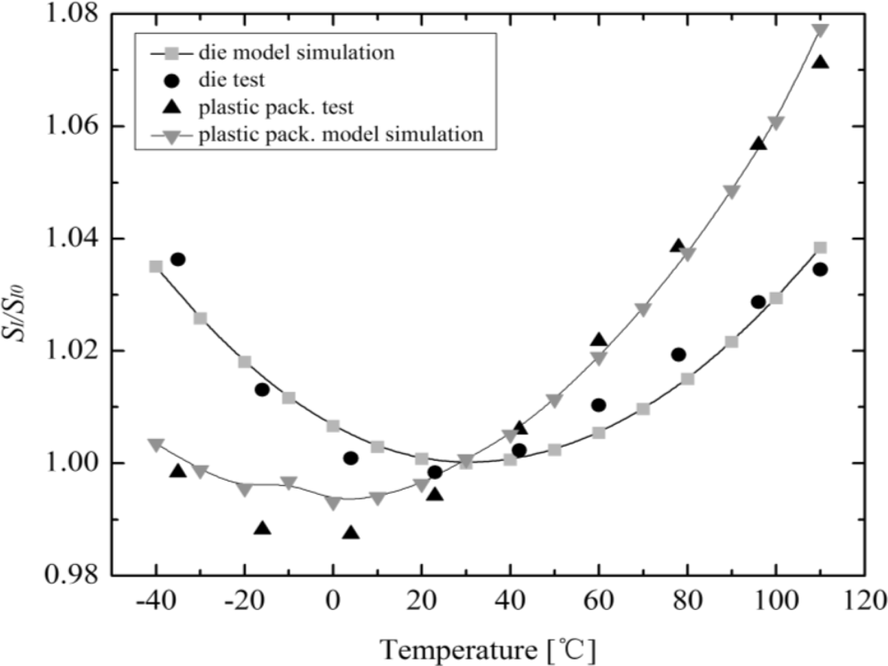 The measured and simulated relative variations of the current-related sensitivity related to the value at room temperature as a function of temperature for the zero-stress mounting of the Hall plate is demonstrated in Figure 7. In this temperature dependence of sensitivity simulation, we assume the zero temperature coefficient αSI of Hall plate takes place at 27 °C, and αSI linearly changes from −500 ppm/°K to +500 ppm/°K in the temperature range from −40 °C to 110 °C. It is obvious that a good accordance is achieved between simulation and experimental results for a die absence of packaging stress influence. Meanwhile, both simulated and tested results of the thermal drift of SI influenced by the plastic packaging stress as a function of temperature are also shown in Figure 7. The simulated thermal drift of SI for a typical plastic package (TSSOP) is also in good agreement with the measured results. It should be pointed out that the piezo-resistance and piezo-Hall effects in packaged Hall sensors are very complex issues, which cannot accurately be modeled by only a small number of key physical and technological parameters. Therefore, a very accurate simulation result cannot be achieved in some cases.