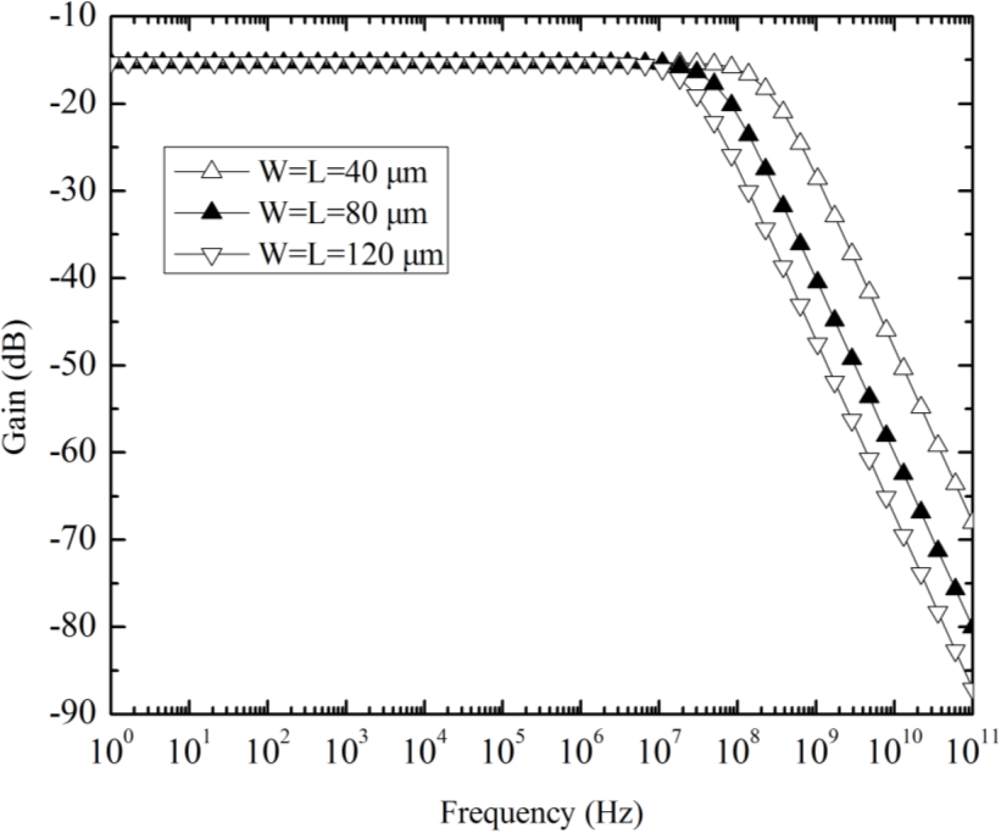 Finally, the ac simulation of the Hall plate was performed at 3 V DC bias. The ratio of finger length to finger width is fixed to 1, while the finger length is taken as a parameter, changing from 40 μm to 120 μm with a step of 40 μm. The simulation results in Figure 8 show that the smaller Hall plate has the higher corner frequency and the −3 dB bandwidth highly exceeds the one MHz range for the largest Hall plate, indicating that any limited frequency response of Hall plate within the working range (usually below 1 MHz) cannot be observed.