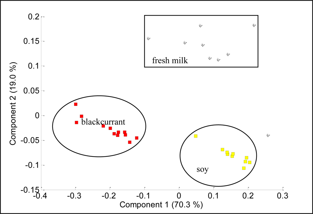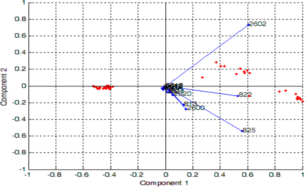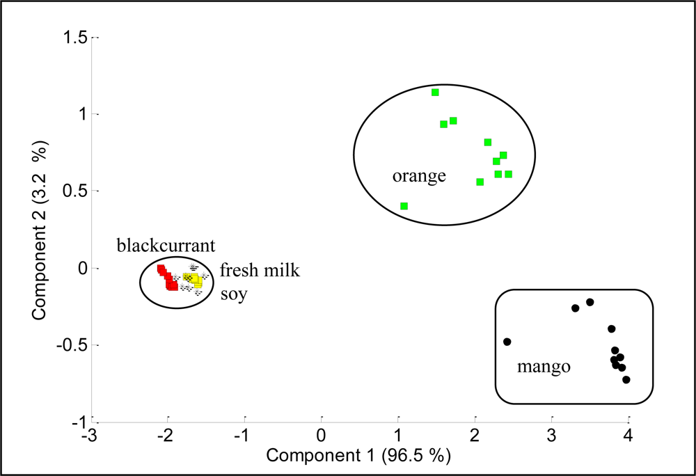 Figure 9 shows the projections of PCA results on the analysis of blackcurrant juice, mango juice, orange juice, soy milk and fresh milk. The data were plotted in a two dimensional plane formed by the first two PCs, that is PC1 and PC2, which captured 99.7% of the data variance. Samples were grouped together into three clusters, where orange and mango are clearly separated from blackcurrant, fresh milk and soy. This means that blackcurrant, fresh milk and soy share relatively comparable patterns and have totally different patterns than orange and mango. Further analysis reveals that orange and mango emanated strong aromas (high voltage responses) while blackcurrant, fresh milk and soy emanated weak aromas (low voltage response). Therefore the high voltage responses captured by orange and mango dominate the PCA of the five beverages, making the weak aroma beverages appear together and strong aroma beverages appear apart. To prove this, we excluded orange and mango from the data set and perform PCA on the blackcurrant, fresh milk and soy data only. Figure 10 shows the results indicating that the PC1 and PC2 are able to clearly separate blackcurrant, fresh milk and soy data. However, the loading values of individual sensors such as TGS2602, TGS822, TGS825, TGS2600, TGS813 and TGS2620 have a significant contribution to the discrimination of the five beverages, as shown in Figure 11.